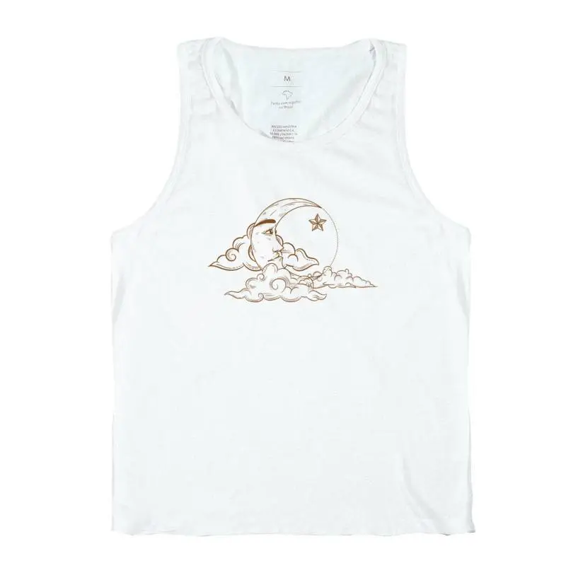 A Regata Lua e Estrela representa a admiração da lua com uma estrela. Enquanto a estrela possui seu próprio brilho, a lua precissa da luz emitida da estrela para poder brilhar. Camisa em tecido 100% algodão e estampa em silk digital.